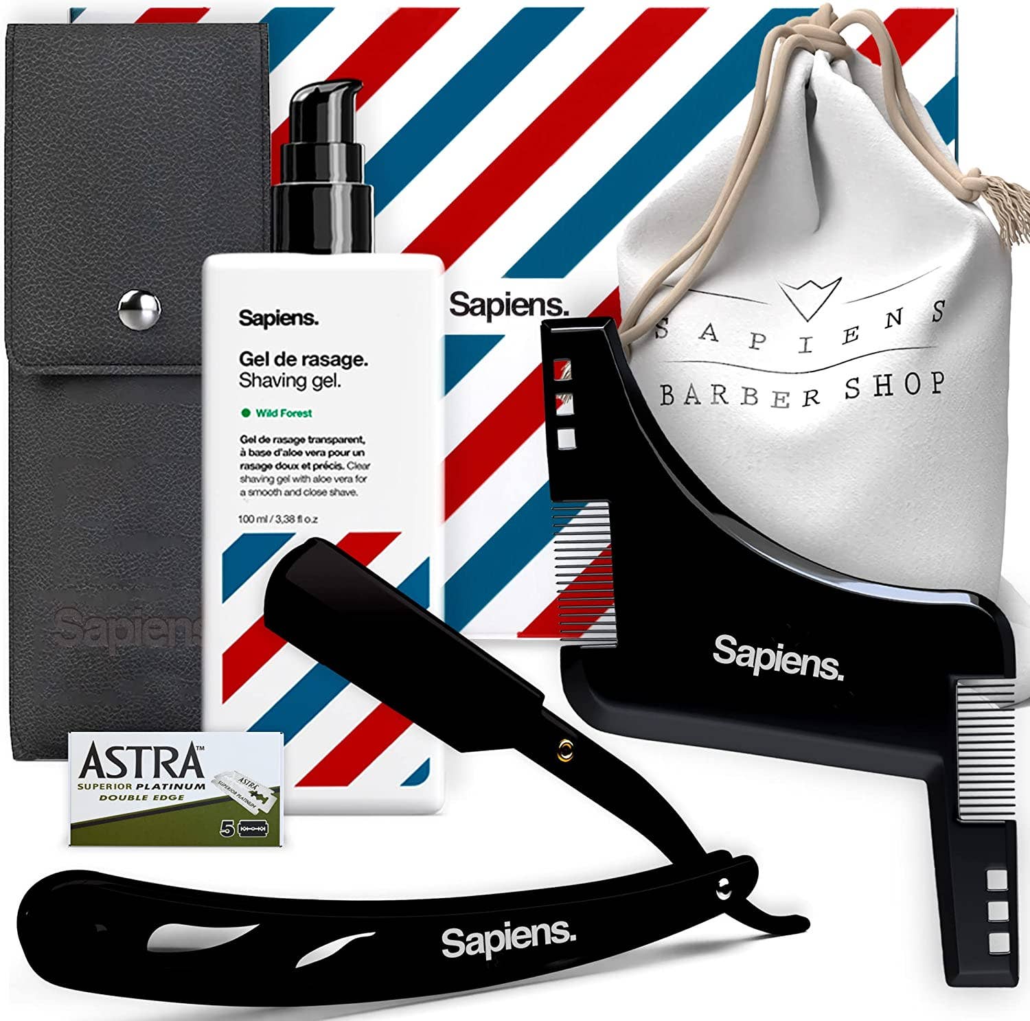 Ce coffret cadeau Sapiens contient un rasoir coupe choux, 5 lames de rasoir Astra, un gel de rasage transparent 50ml, un pochoir à barbe (guide de taille) et une pochette en tissu pour ranger et transporter le tout.