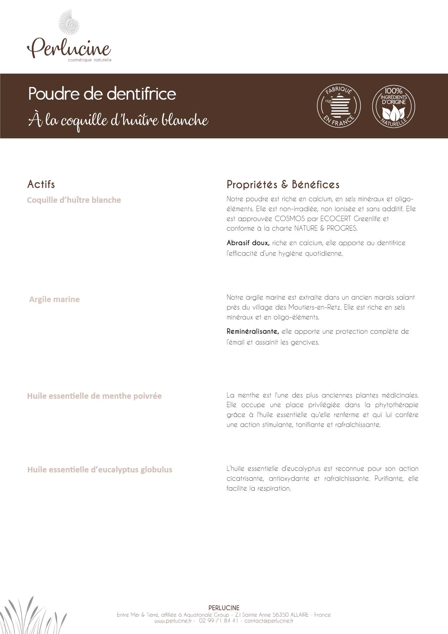Le dentifrice poudre Perlucine : découvrez une nouvelle façon de vous brosser les dents grâce à notre poudre mentholée ! L’alliance de la poudre de coquilles d’huîtres et de l’argile marine offre à votre bouche une propreté irréprochable et une protection complète des gencives et de l’émail. Sa formule unique au menthol et à l’eucalyptus apporte une sensation de fraîcheur surprenante pendant et après utilisation.